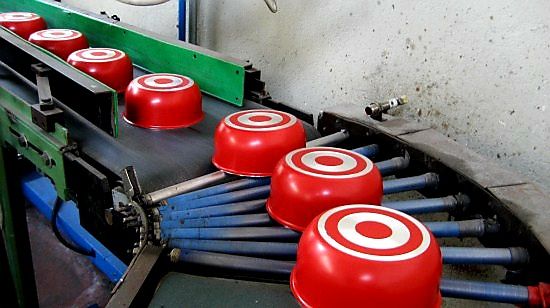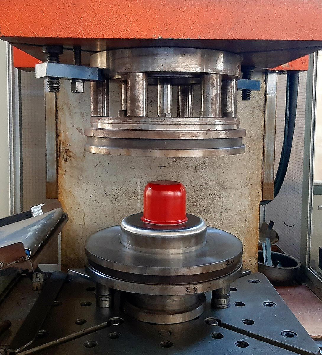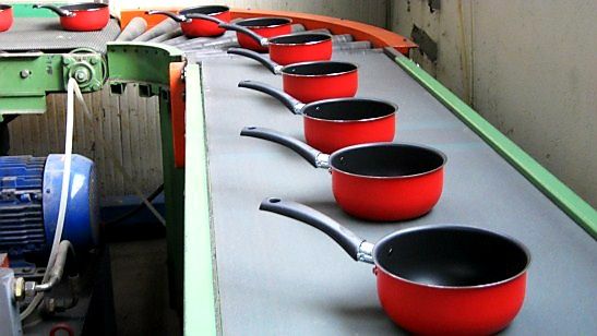 Partendo dalla materia prima, dischi di alluminio puro al 99,5%, si giunge alla produzione di svariati articoli di pentolame antiaderente, finiti imballati pronti per la spedizione.